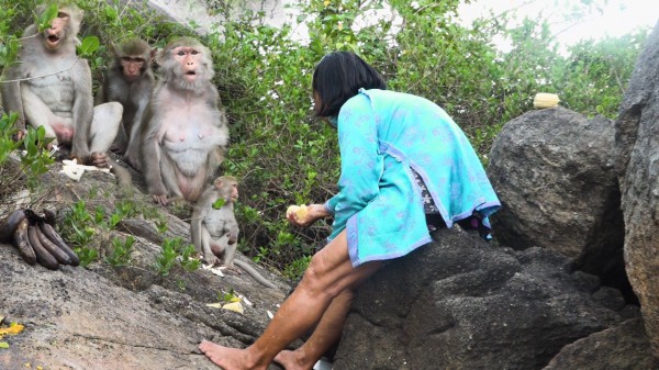 “Tụi bây đâu hết rồi? Mau ra ăn nè. Không ra tao về à nha!”. Chỉ cần nghe giọng bà Út, bầy khỉ hơn chục con hú chí choé, đua nhau chuyền từ cành này phóng qua cành nọ rồi nhảy vọt xuống mõm đá mừng như đứa trẻ gặp mẹ. Bà Út khệ nệ bưng đống trái cây lên mõm đá rải đều rồi giục: “Tới ăn. Tới ăn bây ơi!”. Đàn khỉ có vẻ dè chừng, đưa mắt nhìn quanh. Bà Út quay mặt sang tôi: “Bây né né, núp vào hòn đá kia chứ tụi nó thấy lạ không đứa nào dám xuống ăn” – bà Út hối.