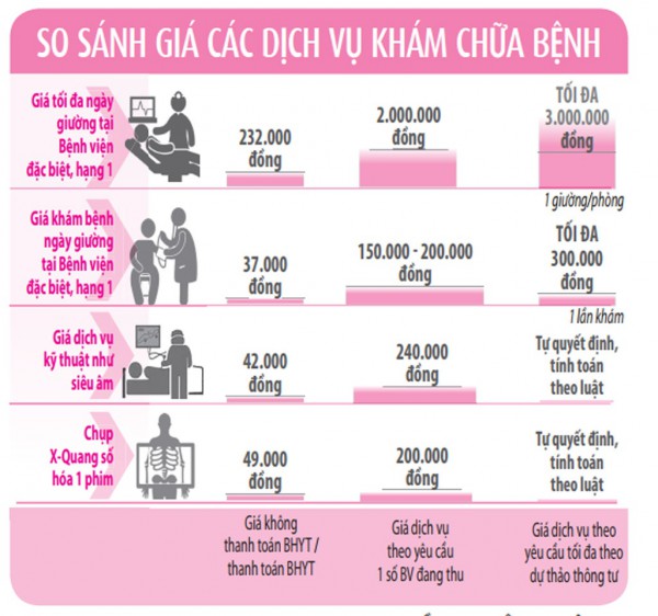 Ông Mai cũng cho hay luật Khám bệnh, chữa bệnh (sửa đổi) đang được Quốc hội xem xét dự kiến sẽ quy định rõ giá dịch vụ khám bệnh, chữa bệnh sẽ được tính đúng, tính đủ các yếu tố cấu thành giá, tức các chi phí cho hoạt động khám chữa bệnh. Theo đó, nhà nước sẽ chỉ định giá và là giá khung (giá trần) chung cho các BV công lập. Các cơ quan quản lý nhà nước sẽ quy định cụ thể đối với các cơ sở thuộc quyền quản lý. Đây sẽ là giá cho các dịch vụ khám chữa bệnh như chăm sóc, giường bệnh, thuốc, thiết bị máy móc… Còn phần “theo yêu cầu” sắp tới chỉ là những dịch vụ “phi y tế”, còn các dịch vụ kỹ thuật y tế trong khám chữa bệnh thì mọi người bệnh đều được tiếp cận như nhau và trên cơ sở một khung giá chung, tránh tình trạng “2 giá” như hiện nay.