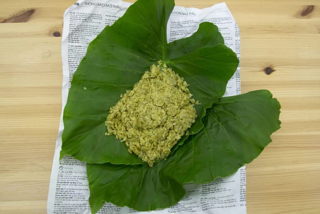 Sau bước giã cốm, thành phẩm được gói vào trong hai lớp lá – lớp trong thường là lá khoai ráy hoặc lá sen để giữ độ ẩm và màu xanh, lớp ngoài là lá sen có hương thơm thoang thoảng. Gói cốm vuông vắn, gọn gàng, trông như một gói quà – bởi người bán còn tinh tế dùng những cọng rơm nếp tẻ cột lại.