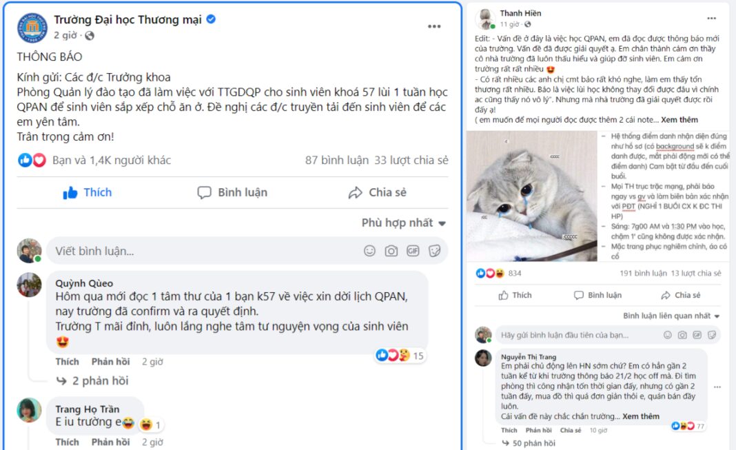 Nguyễn Thị Q., sinh viên K56, thể hiện sự tự hào về ngôi trường mình đang học: “Mới đọc tâm thư của một bạn K57 về việc xin dời lịch quốc phòng an ninh, nay trường đã hồi âm và ra quyết định. Trường Thương mại mãi đỉnh, luôn lắng nghe tâm tư nguyện vọng của sinh viên”.