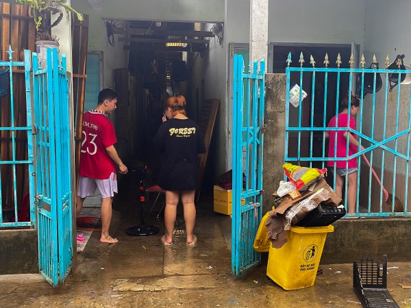Sau khi nước rút, sinh viên đã tất bật dọn dẹp rác thải, bùn đất ra khỏi dãy trọ.