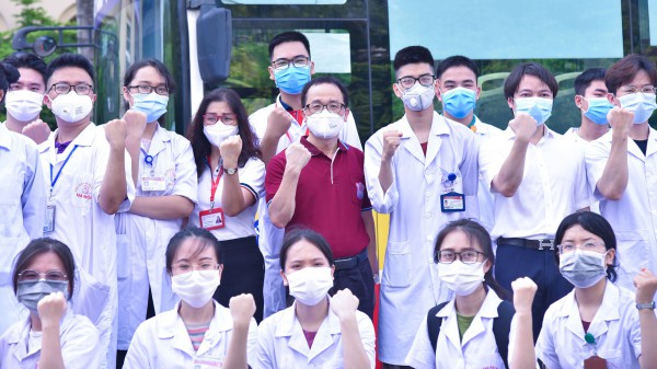 GS Tạ Thành Văn (áo đỏ), Chủ tịch Hội đồng trường Trường ĐH Y Hà Nội, và các sinh viên của trường |