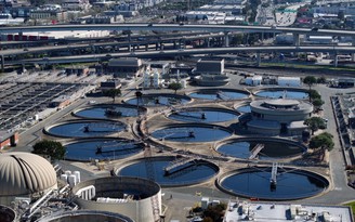 Những vũng nước tại nhà máy xử lý nước thải thuộc khu tiện ích đô thị East Bay, bang California (Mỹ) hồi tháng 3.2024 ẢNH: AFP