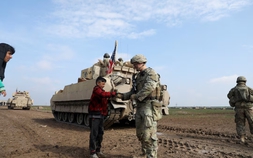 Một binh sĩ Mỹ nắm tay một cậu bé trong cuộc tuần tra chung với lực lượng Syria ở vùng nông thôn Qamishli (đông bắc Syria) ngày 8.2.2024 ẢNH: REUTERS