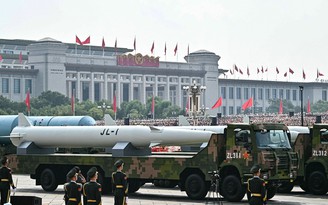 Tên lửa đạn đạo hạt nhân thế hệ đầu tiên JL-1 phóng từ tàu ngầm được nhìn thấy tại quảng trường Thiên An Môn, Bắc Kinh (Trung Quốc) ngày 3.9.2025 ẢNH: AFP