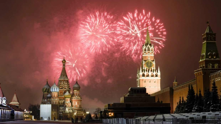 Dù bị ảnh hưởng bởi các biện pháp chống dịch Covid-19, nhưng Nga vẫn tổ chức màn bắn pháo hoa tại một số khu vực. Trong ảnh là màn pháo hoa đẹp mắt trên bầu trời khu vực Nhà thờ St. Basil, Điện Kremlin và Tháp Spasskaya được quan sát từ Quảng Trường Đỏ.
