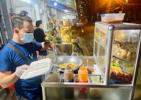 Trên chiếc xe gắn máy, anh Trần Quốc Vinh (31 tuổi, ngụ Q.Bình Thạnh, TP.HCM) cố định một tủ kính chất đủ loại cá viên, bò viên, tương ớt, sa tế và để vừa đủ chiếc bếp ga mini. Anh chọn địa điểm bán hàng là khu vực dân cư tại P.Thảo Điền, TP Thủ Đức, kế bên xe anh là quầy nước ép, sinh tố của một người quen khác. Đó là tình cảnh quen thuộc mà các hướng dẫn viên du lịch này đã phải trải qua trong năm cũ 2021.