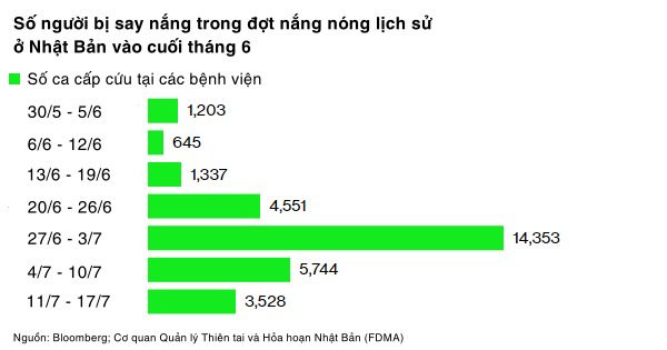 Nhật Bản cũng là một trong những quốc gia bị ảnh hưởng bởi đợt nắng nóng kỷ lục đang ảnh hưởng đến khu vực bán cầu bắc. Vào tháng 6 – thông thường là thời điểm tương đối mát mẻ và là mùa mưa, nhiệt độ ở Tokyo đã vượt quá 35 độ C trong 6 ngày liên tiếp, theo Cơ quan Khí tượng Nhật Bản. Đợt nắng nóng diễn ra trên toàn quốc đã khiến hơn 14.000 người phải nhập viện cấp cứu trong tuần kết thúc vào ngày 3/7.
