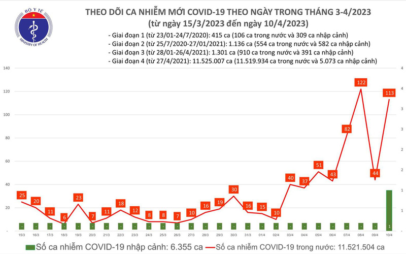 Theo Bản tin Bộ Y tế về tình hình chống dịch COVID-19, ngày 10/4, ghi nhận 113 ca mắc COVID-19 mới; có 19 bệnh nhân được công bố khỏi bệnh.