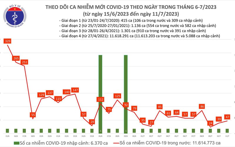 Theo Bản tin Bộ Y tế về tình hình dịch COVID-19, trong ngày 11/7, nước ta ghi nhận 47 ca mắc mới; có 5 bệnh nhân được công bố khỏi bệnh.