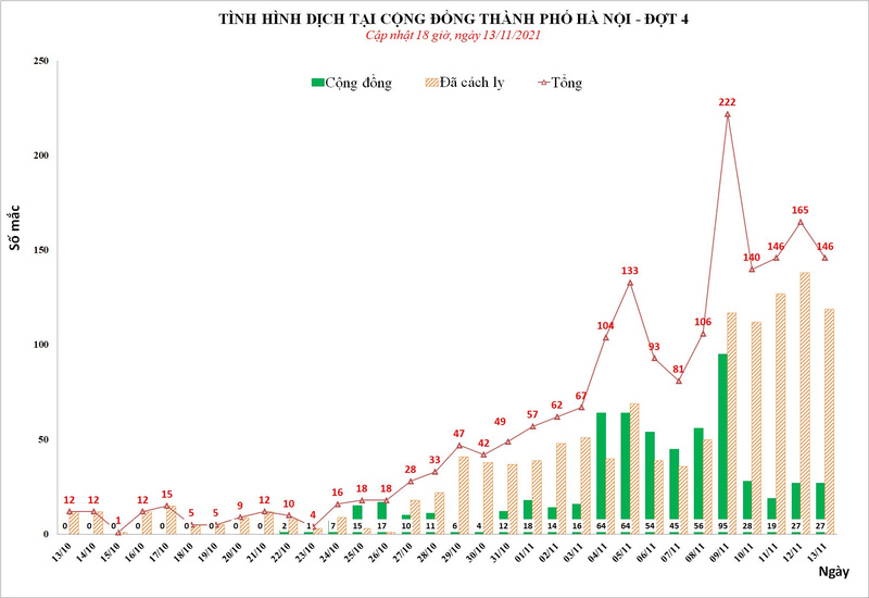 Từ 18h ngày 12/11 đến 18h ngày 13/11, Hà Nội ghi nhận 146 ca dương tính với SARS-CoV-2, trong đó, 27 ca tại cộng đồng, 76 ca tại khu cách ly và 43 ca tại khu phong tỏa.