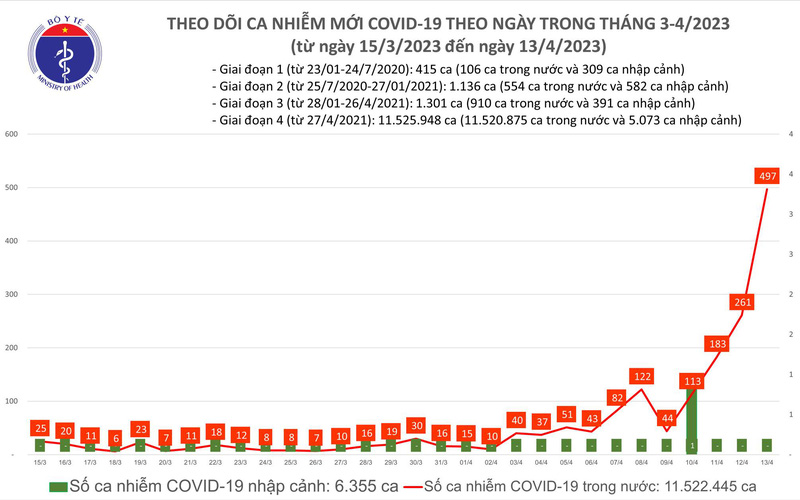 Theo Bản tin Bộ Y tế về tình hình chống dịch COVID-19, ngày 13/4, ghi nhận 497 ca mắc COVID-19 mới; có 37 bệnh nhân được công bố khỏi bệnh.