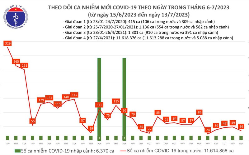 Theo Bản tin Bộ Y tế về tình hình dịch COVID-19, trong ngày 13/7, nước ta ghi nhận 36 ca mắc mới; có 11 bệnh nhân được công bố khỏi bệnh.