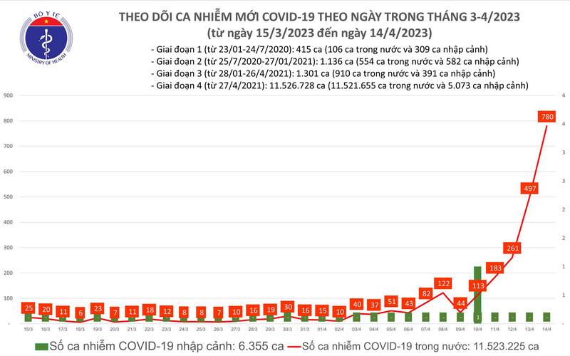 Theo Bản tin Bộ Y tế về tình hình chống dịch COVID-19, ngày 14/4, ghi nhận 780 ca mắc COVID-19 mới; có 104 bệnh nhân được công bố khỏi bệnh.