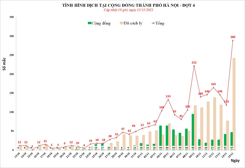 Trong ngày 15/11, trên địa bàn Hà Nội ghi nhận 289 ca mắc mới gồm 47 ca tại cộng đồng, 178 ca tại khu cách ly và 64 ca tại khu phong tỏa.