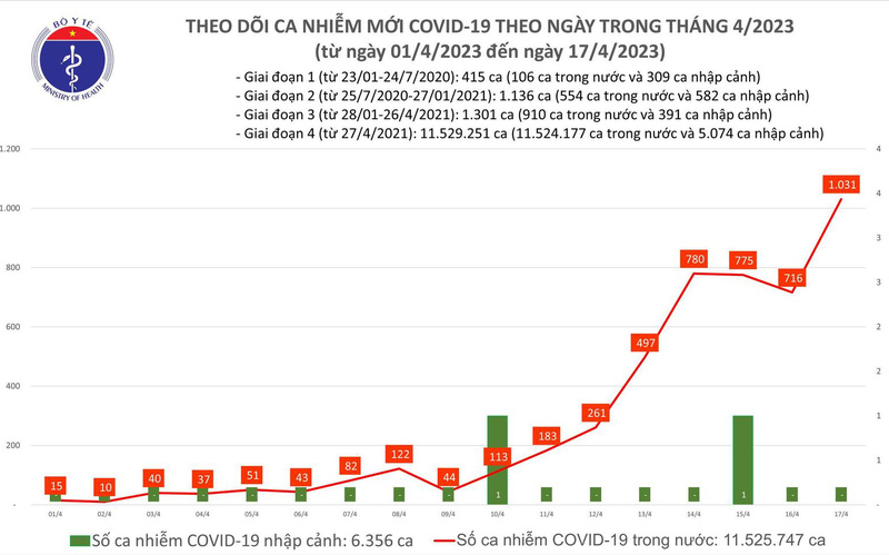 Theo Bản tin Bộ Y tế về tình hình chống dịch COVID-19, ngày 17/4, ghi nhận 1.031 ca mắc COVID-19 mới; có 2 bệnh nhân được công bố khỏi bệnh.