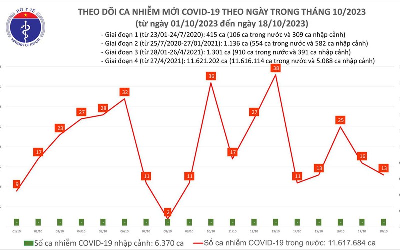 Theo Bản tin Bộ Y tế về tình hình chống dịch COVID-19, trong ngày 18/10, cả nước ghi nhận 13 ca mắc mới, có 16 bệnh nhân được công bố khỏi bệnh.
