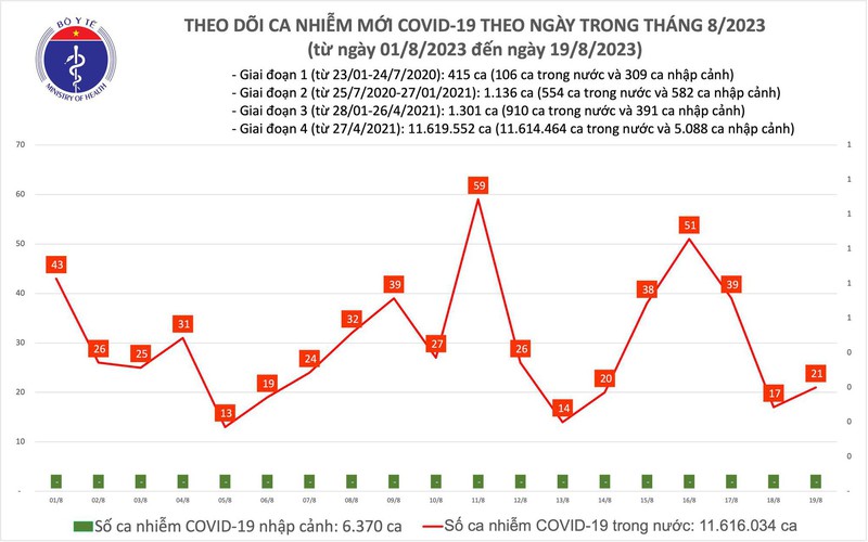 Theo Bản tin Bộ Y tế về tình hình chống dịch COVID-19, trong ngày 19/8, cả nước ghi nhận 21 ca mắc mới, có 15 bệnh nhân được công bố khỏi bệnh.