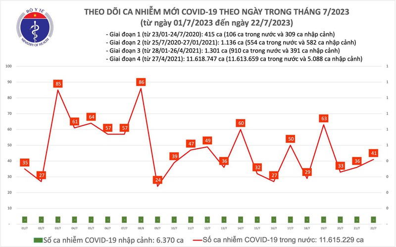 Theo Bản tin Bộ Y tế về tình hình dịch COVID-19, ngày 22/7, cả nước ghi nhận 41 ca mắc COVID-19 mới, có 10 bệnh nhân được công bố khỏi bệnh.