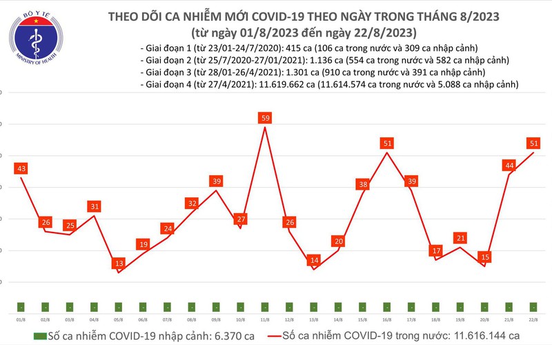 Theo Bản tin Bộ Y tế về tình hình chống dịch COVID-19, trong ngày 22/8, cả nước ghi nhận 51 ca mắc mới, có 11 bệnh nhân được công bố khỏi bệnh.