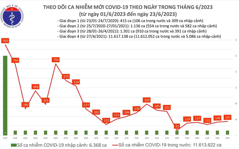 Theo Bản tin Bộ Y tế về tình hình chống dịch COVID-19, ngày 23/6, nước ta ghi nhận 147 ca mắc mới; có 38 bệnh nhân được công bố khỏi bệnh.