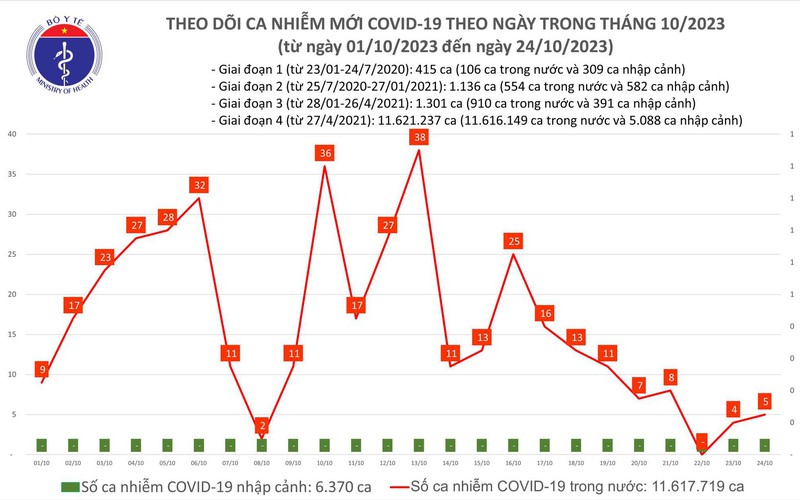Theo Bản tin Bộ Y tế về tình hình chống dịch COVID-19, trong ngày 23/10, cả nước ghi nhận 5 ca mắc mới.