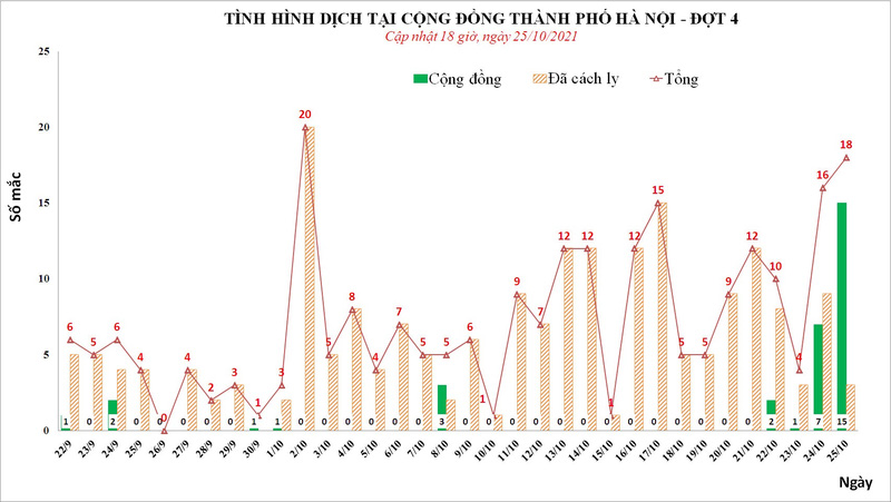 Thống kê của Sở Y tế Hà Nội, ngày 25/10, trên địa bàn thành phố ghi nhận 18 ca dương tính với SARS-CoV-2, trong đó có 3 ca đã được cách ly và 15 ca trong cộng đồng.