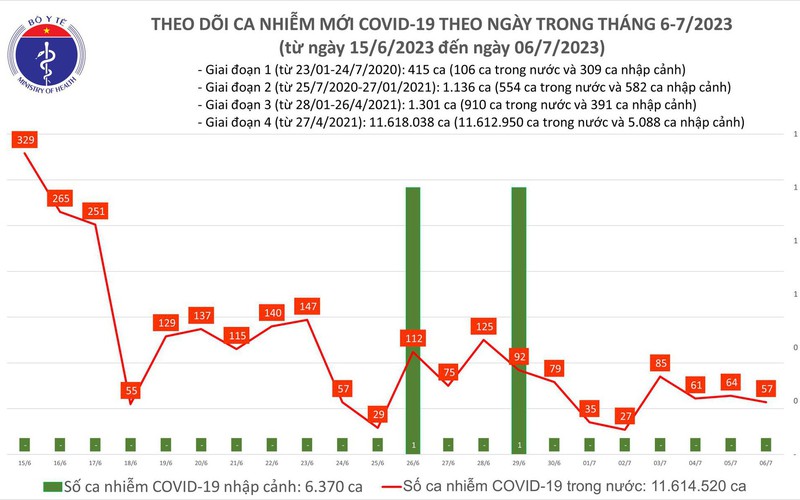 Theo Bản tin Bộ Y tế về tình hình dịch COVID-19, trong ngày 6/7, nước ta ghi nhận 57 ca mắc mới; có 11 bệnh nhân được công bố khỏi bệnh.