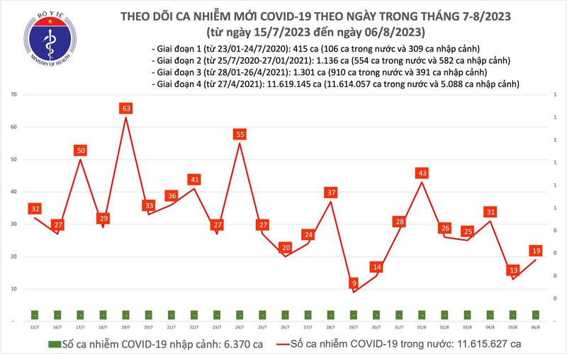 Theo Bản tin Bộ Y tế về tình hình dịch COVID-19, ngày 6/8, cả nước ghi nhận 19 ca mắc mới; có 1 bệnh nhân được công bố khỏi bệnh.