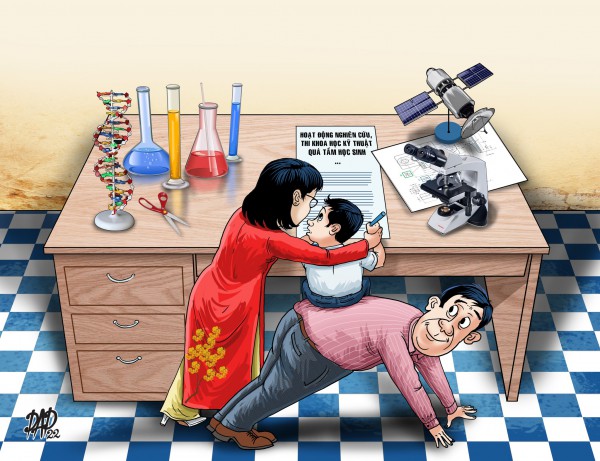 Chính vì thực tế này mà GV ở Q.Tân Bình cho biết: “Hầu hết các đề tài nghiên cứu khoa học hàn lâm của HS là do GV can thiệp bằng cách làm thay, đi mua, sao chép từ các luận văn thạc sĩ, luận án tiến sĩ hoặc người bảo trợ – cha mẹ HS, các nhà khoa học “ra tay”. Các em chỉ làm một vài công đoạn đơn giản, sau đó học thuộc lòng nội dung và đi thi”.