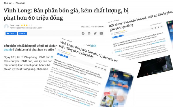 Trước đó, ngày 9.1, cơ quan chức năng tỉnh Vĩnh Long lập biên bản đối với ông T.C.P, chủ hộ kinh doanh P.H (ấp Trà Ngoa, xã Trà Côn, H.Trà Ôn, Vĩnh Long), về hành vi bán phân bón có chất lượng không phù hợp với quy chuẩn kỹ thuật tương ứng (giá trị lô hàng hóa vi phạm 36 triệu đồng); buôn bán phân bón là hàng giả về giá trị sử dụng, công dụng (giá trị lô hàng hóa vi phạm 14 triệu đồng).