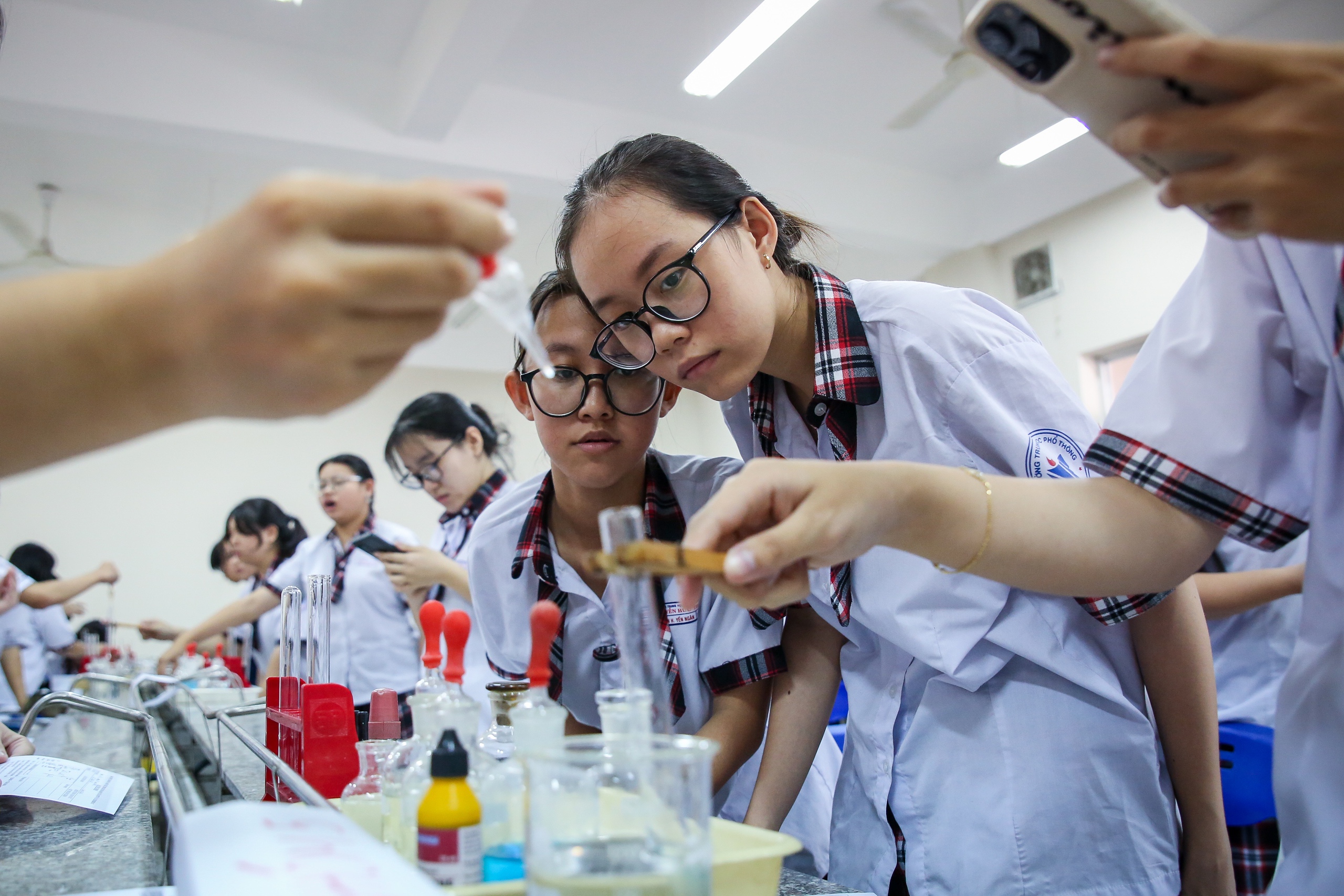 Học sinh trong giờ thí nghiệm môn hóa tại Trường THPT Nguyễn Hữu Thọ (Q.4, TP.HCM)