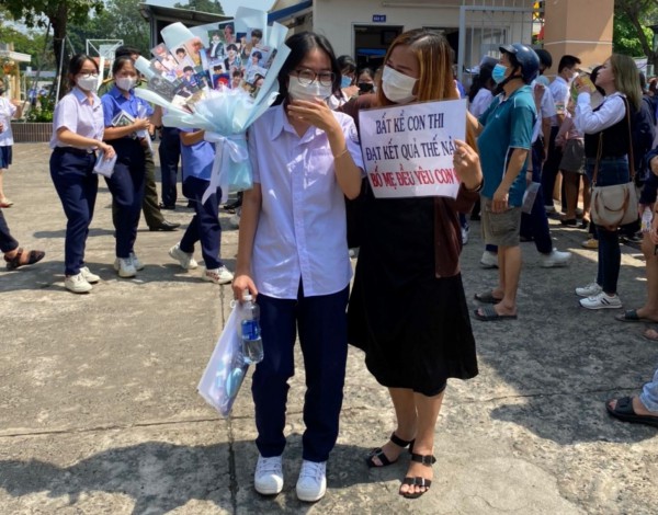 Giữa cái nắng chói chang và không khí thi cử căng thẳng, nhiều người ở điểm thi vào lớp 10 tại Trường THPT Phú Nhuận cảm thấy bất ngờ với hình ảnh chị Thùy Trâm (ngụ Q.3, TP. HCM) cầm hoa đợi con gái kèm theo tấm bảng với nội dung: “Bất kể con thi đạt kết quả như thế nào bố, mẹ đều yêu con”.