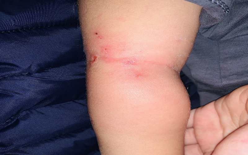 Theo lời gia đình kể lại, cách nhập viện 6 ngày, bệnh nhi bị muỗi đốt vùng khuỷu tay phải, ngứa gãi trợt da, gia đình đã băng lại. Sau đó, bệnh nhi sốt cao từng cơn, vùng muỗi đốt sưng nề lan tỏa, ngứa, nóng đỏ, da nổi ban sẩn đỏ vùng mặt, nôn thức ăn, mệt nhiều.