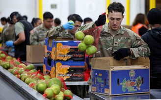 Các binh sĩ đóng gói đồ viện trợ tại ngân hàng thực phẩm ở TP.Los Angeles (bang California) ẢNH: REUTERS