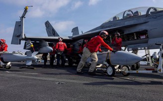 Các thủy thủ trên tàu sân bay USS Abraham Lincoln nạp tên lửa cho tiêm kích F/A-18F Super Hornet trong chiến dịch tấn công Iran Ảnh: Reuters
