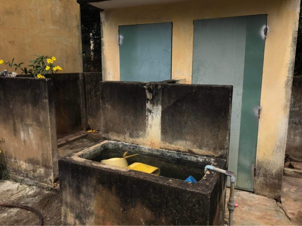 Nhà vệ sinh của trường gồm 2 phòng, thường chỉ có giáo viên sử dụng. Khu vực còn lại không có mái che, cũng không lắp cửa chắn, trên nền đất được kê những viên gạch chéo thô sơ. Nhà vệ sinh cũng không phân biệt giới tính, nam nữ đều sử dụng chung. Sau khi đi vệ sinh, HS ra bể chứa để múc nước dội. Bể chứa bám đầy rêu xanh và lăng quăng trong nước vì không có nắp đậy kỹ càng. Mặc dù trường có lắp đặt bồn rửa tay và trang bị xà phòng, nhưng chúng tôi chứng kiến một vài HS dùng tay rửa trực tiếp trong bể chứa.