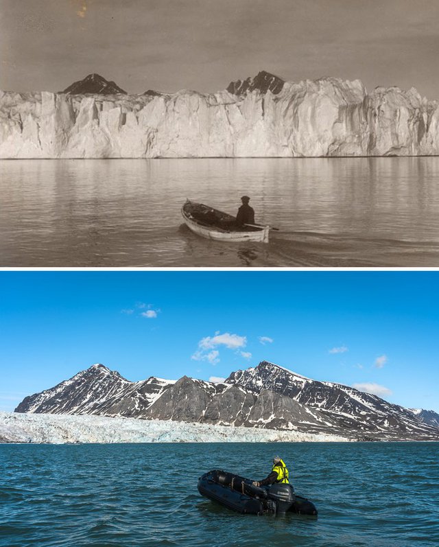 Biến đổi khí hậu đang tác động vô cùng xấu đến tình trạng băng tan. Để mọi người thấy rõ hơn những tác động này, nhiếp ảnh gia Neill Drake đã tái tạo bức ảnh sông băng được chụp ở Bắc Cực hơn một thế kỷ trước, làm nổi bật lượng băng giảm mạnh như thế nào ở hiện tại và đưa ra lời cảnh báo về biến đổi khí hậu.