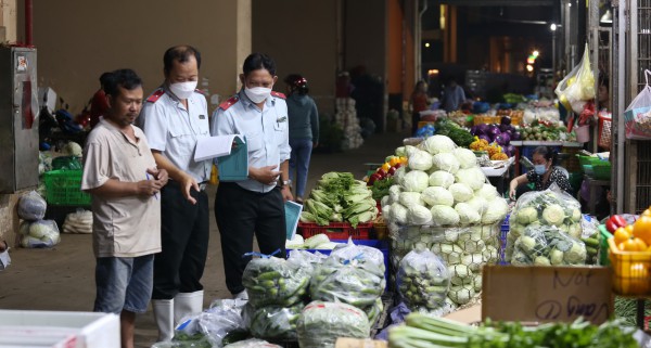 Cán bộ thuộc Ban Quản lý an toàn thực phẩm TP.HCM kiểm tra nguồn gốc thực phẩm tại chợ đầu mối Bình Điền (Q.8)