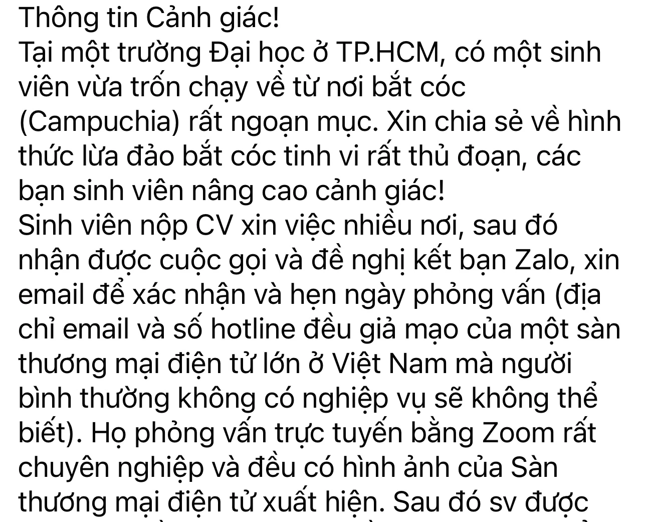 Các bài viết đã chia sẻ câu chuyện sinh viên một trường ĐH tại TP.HCM vừa trốn chạy về từ nơi “bắt cóc” (Campuchia), qua đó cảnh báo với sinh viên về hình thức lừa đảo “bắt cóc” tinh vi, thủ đoạn. Câu chuyện được chia sẻ trên các trang kể một sinh viên nộp đơn xin việc nhiều nơi, sau đó nhận được cuộc gọi và đề nghị kết bạn Zalo, xin email để xác nhận và hẹn ngày phỏng vấn.