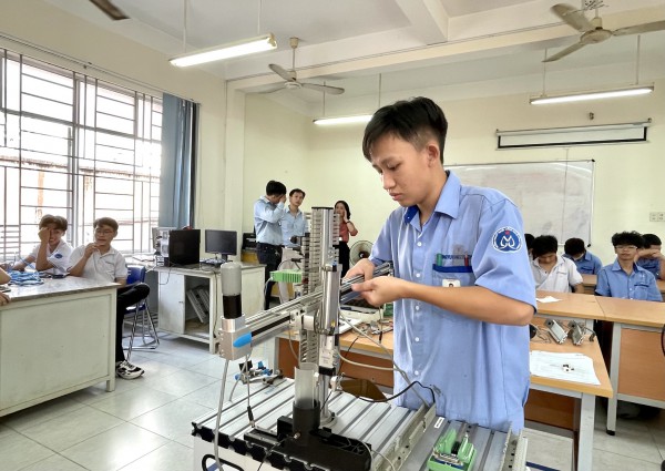 Chăm chú thao tác tại phòng thi nghề cơ điện tử |