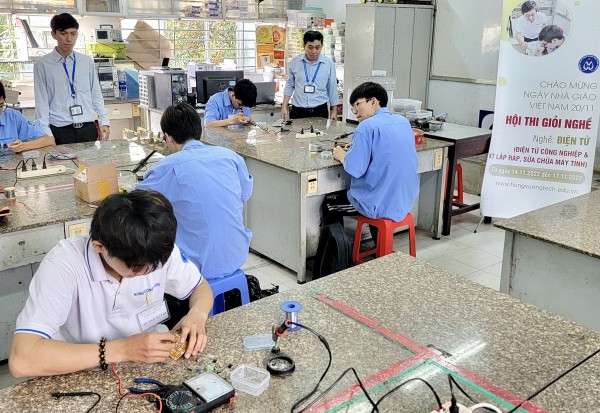 Học sinh của Trường Trung cấp nghề Kỹ thuật-Công nghệ Hùng Vương tỏa về các phòng thi tay nghề giỏi để so tài ở các nghề bảo trì hệ thống thiết bị cơ khí, điện tử, cơ điện tử, tiện CNC, thiết kế đồ họa, quản trị hệ thống mạng CNTT, may áo dài nam-nữ, lắp đặt máy điều hòa không khí và công nghệ ô tô.