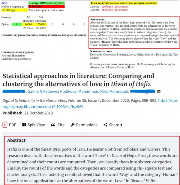 Hình chụp trang web 123mi.ru (trên) cho thấy bài báo của Ph.K.H đã được rao bán nhiều tháng trước khi công bố trên tạp chí Digital Scholarship in the Humanities vào ngày 21.10.2019 (dưới) |