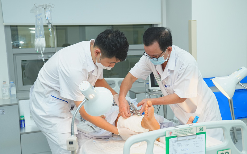 TS. Nguyễn Viết Ngọc – Khoa Chấn thương chi trên và Vi phẫu thuật, Viện Chấn thương chỉnh hình trực tiếp khám và thực hiện ca phẫu thuật. Cuộc phẫu thuật được triển khai 2 kíp mổ liên tục trong khoảng 6 giờ. Sau phẫu thuật, bệnh nhân chuyển về Khoa Hồi sức cấp cứu để theo dõi và điều trị hồi sức do lượng máu mất nhiều ngay sau khi bị thương và tình trạng tái tưới máu của 2 cẳng chân sau trồng lại.