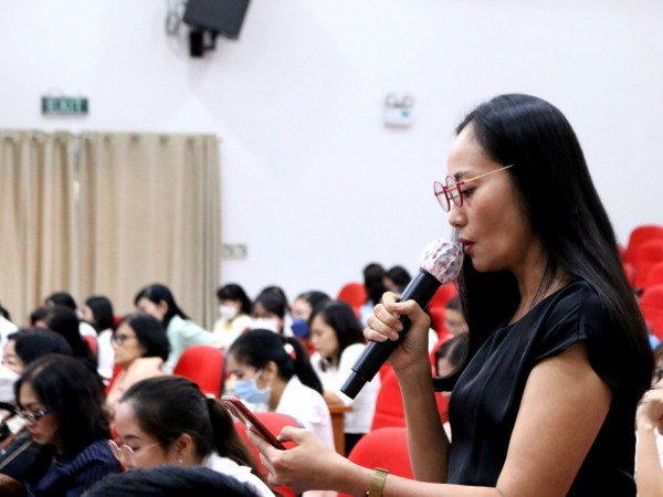 Bà Ngô Phạm Hạnh Thúy, Chủ nhiệm Câu lạc bộ nữ nghệ sĩ TP.HCM, nêu ý kiến tại hội nghị tiếp xúc cử tri |