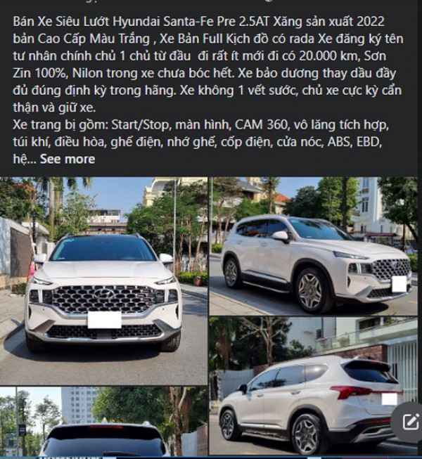 Tham khảo thị trường ô tô cũ, vào thời điểm cuối năm, không khó để tìm thấy những chiếc xe còn mới nhưng có giá bán rất rẻ. Chẳng hạn một chiếc Hyundai SantaFE sản xuất năm 2022, đang được chào bán với mức giá 1,069 tỷ đồng, nhưng vẫn có thể thương lượng thêm nếu thiện chí mua. Người bán cho biết, chiếc xe thuộc phiên bản 2.5 AT Premium (bản cao cấp), sử dụng xăng, mới lăn bánh được 20.000 km. Khi mua mới, giá niêm yết của chiếc xe này là 1,240 tỷ đồng. Tính cả chi phí lăn bánh, chủ nhân sẽ phải tốn một khoản tiền dao động từ 1,386 – 1,430 tỷ đồng (tùy từng địa phương đăng ký xe). Như vậy, người bán chấp nhận chịu lỗ cao nhất lên đến khoảng 361 triệu đồng, cho 20.000 km lăn bánh.