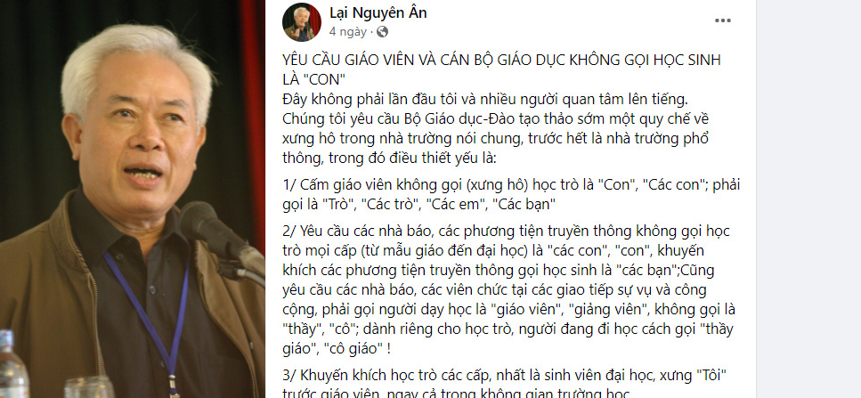 Trong bài viết trên trang cá nhân của mình, ông Ân “yêu cầu Bộ GD-ĐT thảo sớm một quy chế về xưng hô trong nhà trường nói chung, trước hết là nhà trường phổ thông”.