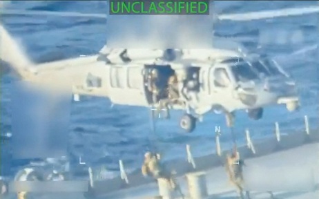 Đoạn video dài 45 giây do bà Bondi đăng tải cho thấy 2 trực thăng tiếp cận một con tàu và những người có vũ trang mặc đồ ngụy trang đu dây xuống tàu.