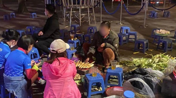 Chị H. và nhóm bạn tranh luận với chủ quán khoai nướng (áo phao, ngoài cùng bên phải) hơn một giờ đồng hồ về giá |
