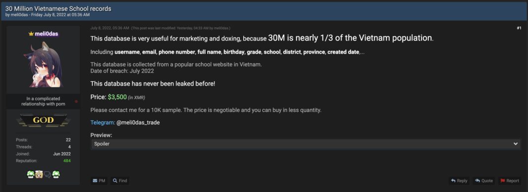 “Meli0das” cho biết dữ liệu được khai thác từ “một trang web phổ biến về giáo dục” ở Việt Nam vào tháng 7.2022. Mỗi bản ghi bao gồm tên người dùng, địa chỉ email, số điện thoại, họ tên, điểm số, trường học, quận (huyện), tỉnh (thành phố), ngày khởi tạo…